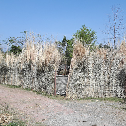 Not wanting to spend any money on this fencing, we started looking for 'desi' ways to build a fence. We gathered all the wood which had been cut while pruning trees over the last few years and used them as the posts. We had some extra barbed wire lying around. And we decided to use date palm leaves and sarkanda (Bulrush) stems for the covering of the fence.
